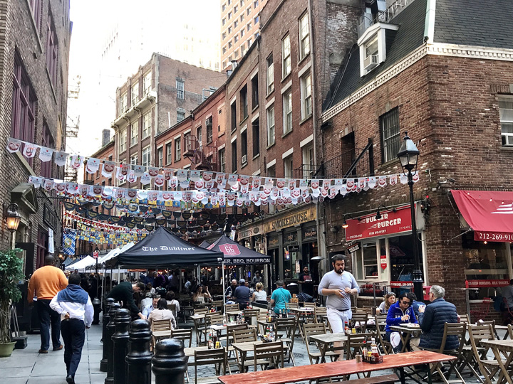 Den här gatan från tidigt 1600-talet är en av de äldsta i New York City. Kanske inte så märkvärdigt när man kommer från Sverige, men roligt och otippat att den dyker upp här mellan alla skyskraporna i Wall Street-området. Gatan delas i mitten av skyskrapan på 85 Broad Street. Gatans västra sida är rätt ointressant, du vill ta dig till den historiska delen mellan Coenties Alley och William Street. Om du kommer på vintern är det här en lugn och fin liten historisk kullerstensgata med vackra hus som alla inhyser någon form av restaurang, pub eller pizzeria. Under den varmare delen av året förvandlas gatan till en enda stor utomhus servering fylld med glada och ibland högljudda gäster. Inga kulinariska höjdpunkter på menyerna, men ett bra stopp om man är hungrig eller bara vill ta sig en öl.